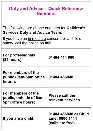 If you think a child in Kirklees is being abused or mistreated or you have concerns about a child's wellbeing or need advice and support about a child with a disability you should call and speak to someone on one of the following numbers: